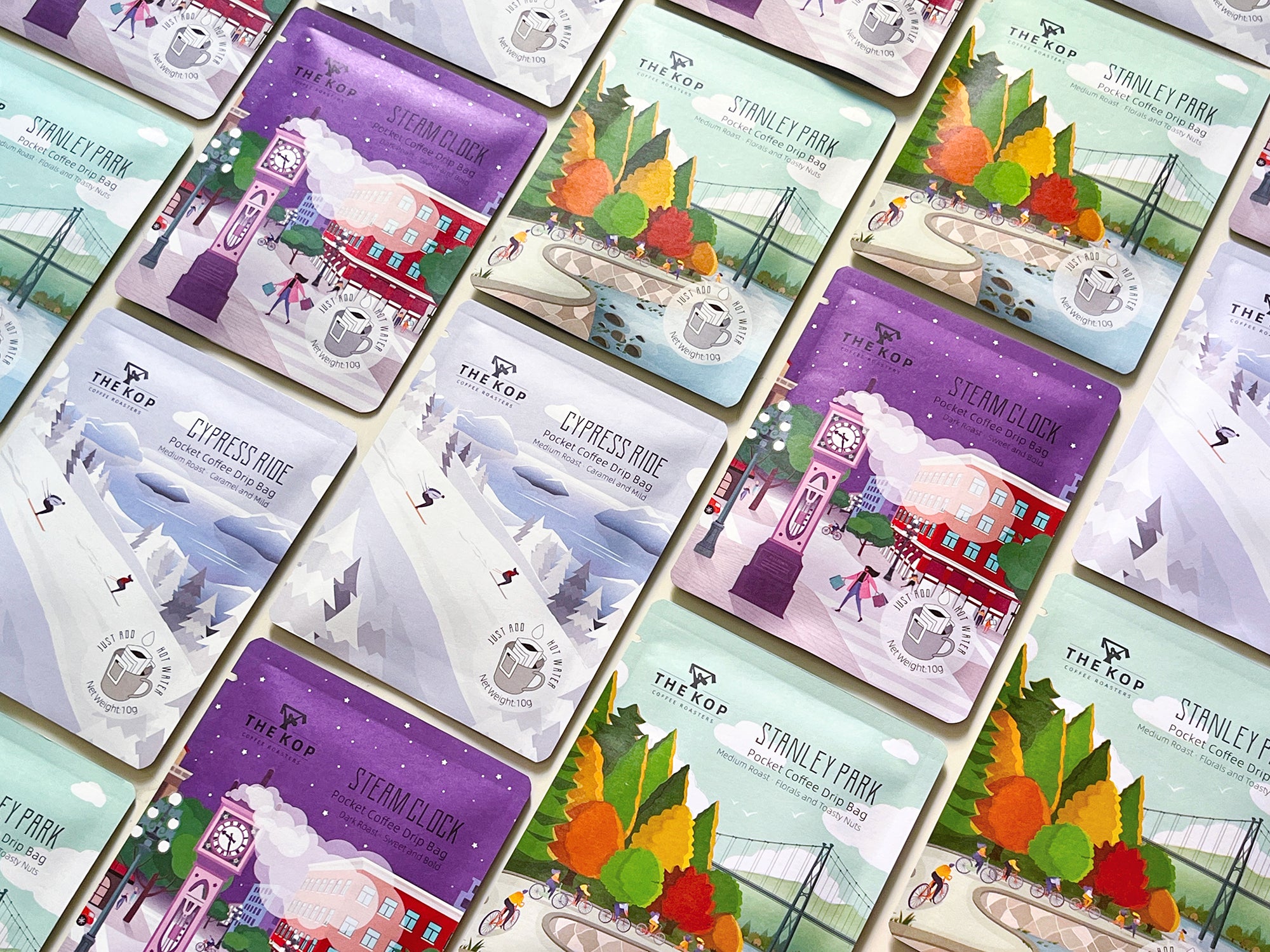 Our designer choicely illustrated the most spectacular landmarks and attractions in Greater Vancouver to package different varieties of specialty coffees selected attentively by our certified coffee Q-grader. After numerous efforts on trial and error, we are now grateful to introduce three pocket coffee drip bags, Stanley Park blend | Medium Roast, Steam Clock blend | Dark Roast and Cypress Mountain blend | Medium Roast.
