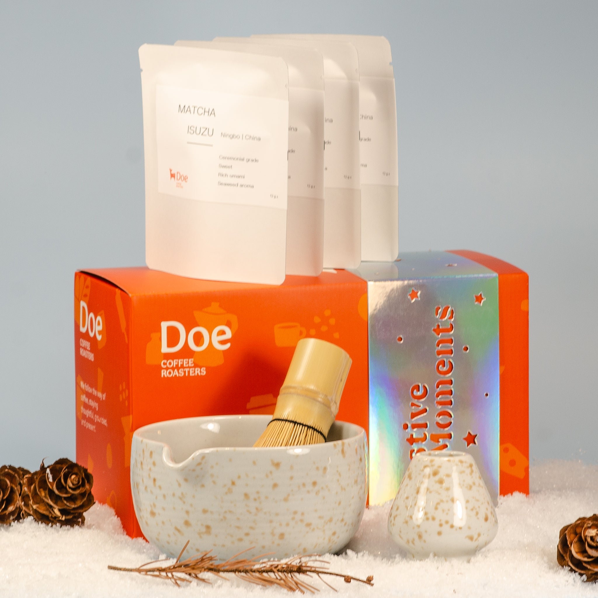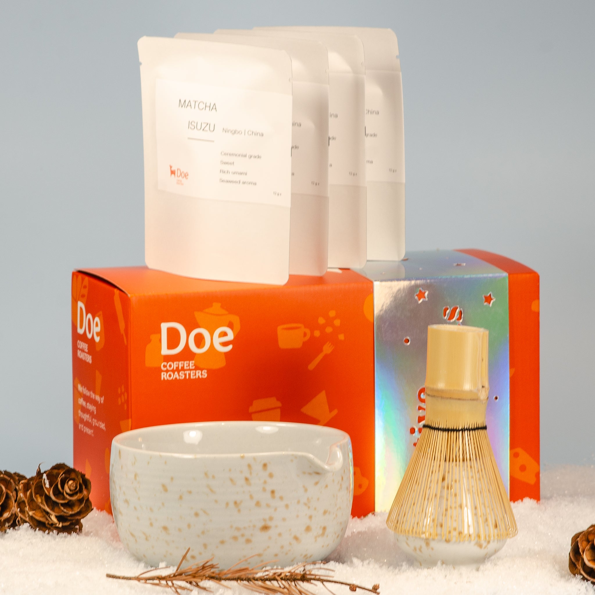 The Matcha Lovers Gift Set brings together a handcrafted bowl, traditional bamboo whisk, and whisk holder—paired with four sachets of our smooth and elegant ISUZU Matcha.